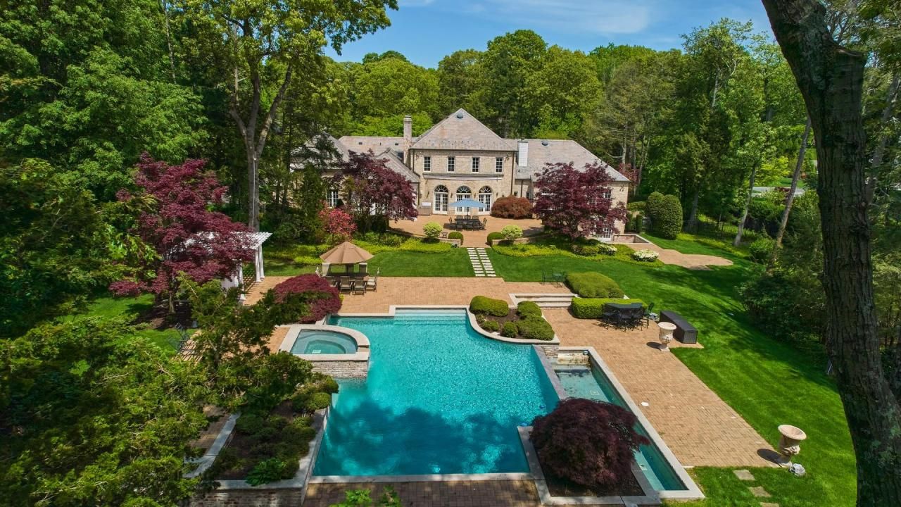Edit mortgage details for a more accurate paymentMagnificent Brick Colonial in Prestigious Old Brookville tucked away on a private cul-de-sac in one of Long Islands most exclusive enclaves, this stately brick Colonial embodies timeless elegance and refined indoor-outdoor living. Designed with an eye for classic proportions and luxury detail, the 8,500-square-foot residence is crowned with a slate roof and surrounded by manicured, park-like grounds spanning two landscaped acres. A tree-lined courtyard framed by evergreens and flowering trees sets the stage for grandeur. Double entry doors lead to a dramatic circular marble foyer with a gold-leaf domed ceiling. A sweeping curvilinear staircase ascends to the second level, while the light-filled main rooms overlook the spectacular property. The gracious living room, ideal for entertaining, features a custom wood built-in bar, a dramatic mantled fireplace, and three sets of French doors with Palladian windows opening to the gardens. The formal dining room with a round table is capable of seating 12 and is finished in Venetian plaster and highlighted by a luxurious gilded domed gold-leafed ceiling. The open-concept kitchen and adjacent family room offer an inviting space for everyday living and gatherings, complete with a beamed cathedral ceiling and seamless access to the expansive brick patio, gardens, outdoor bar, and a resort-style swimming pool with built-in hot tub and cascading waterfalls. The luxurious main-level primary suite is privately situated in its own wing, accessed via a long hallway. It features expansive fitted closets, a marble bath, and a private staircase to the homes wellness center with steam room, sauna, two full baths, and direct pool access. A flexible adjoining bedroom suite with a full bath can serve as an office, nursery, or sitting room with fireplace. A powder room, service wing with half bath, laundry room, and a second staircase to the lower level complete the main floor. Upstairs, four generously sized bedrooms, three full bathrooms, and a large cedar closet room offer ample space for family and guests. The fully finished walk-out lower level enhances the homes lifestyle offering with a large recreation room, a ballet/yoga studio with mirrored wall and barre, a built-in bar. The two acre grounds are as exceptional as the home itself, showcasing an in-ground pool, mature trees and plantings, expansive multi-level brick patios, and a portico with a wet bar?perfect for hosting unforgettable events or enjoying tranquil days at home.