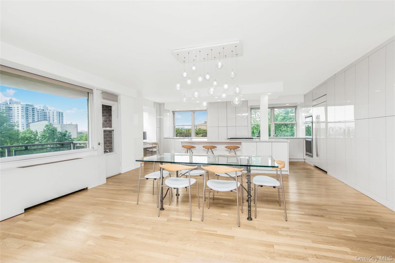 Come discover the crown jewel of Hudson Tower! This beautifully reimagined residence, originally a three-bedroom, has been thoughtfully reconstructed into a spacious two-bedroom, two-bathroom home with an expansive private terrace. The open layout and modern design evoke the feeling of a Tribeca loft, blending sophistication with comfort. Included is a deeded garage space on the upper level, adding both convenience and value. The chef's kitchen is truly a showstopper - showcasing gleaming white quartz countertops, a massive 10' x 4' island with seating, and an abundance of custom white gloss cabinetry. Top-of-the-line appliances include a Thermador stovetop, built-in refrigerator, JennAir double ovens, built-in microwave and warming draw, double sinks, and two built-in dishwashers. A dedicated built-in office area adds modern functionality to the space. The sun-drenched living, dining, and kitchen areas feature beautiful wood floors and benefit from south and west exposures, filling the home with natural light throughout the day. Oversized windows and recessed lighting create an inviting ambiance, while the dining area easily accommodates large gatherings. Direct access to the gigantic private terrace creates the ultimate space for entertaining, relaxing, or dining al fresco. The master suite is a retreat in itself, offering massive his-and-hers walk-in closets and a luxurious exceptionally large en-suite bathroom with double sinks, porcelain tile finishes, and a walk-in shower stall complete with bench seating and multiple shower heads. Additional highlights include nearly 8-foot doorways, built-in speakers in both the living room and master bedroom, abundance of built-in custom cabinetry for storage, and custom covers for the HVAC units - thoughtful details that elevate both style and comfort. Monthly maintenance conveniently includes indoor parking, gas, electric, central A/C and heat, and water. Hudson Tower amenities enhance your lifestyle with a 24-hour doorman, seasonal pool, bicycle and regular storage, garage parking, and a playground. This prime location is steps from restaurants, shopping, parks, schools, and public transit, including local/express buses. Plus, the Spuyten Duyvil Metro North Station nearby makes commuting to Grand Central a breeze in under 25 minutes. This is a rare offering that combines luxury, functionality, and style in one of the most desirable buildings - a must-see!