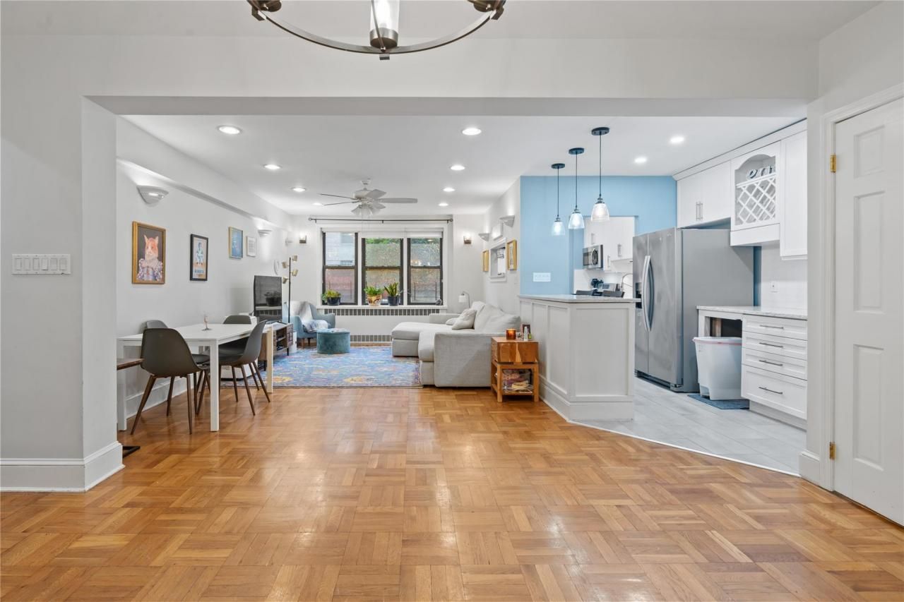Move right in to this fully updated, modern concept 2 bedroom home in the Buchanan. Enter into a wide open space just past the huge entry closet, welcomed by an extended open kitchen with island and thoughtful built-ins for all your wares. Work, play, study and hang in this fabulous spot that anchors the home. Plenty of room for dining and living area with a row of windows that invite light into the living room. Recessed lighting and charming muted wall sconces take over in the evening. Light, white modern kitchen with pass-through makes for a super-functional chefs kitchen. Deep sink, stainless appliances including dishwasher, under-cabinet lighting and subway tile backsplash complete the kitchen package. The sleeping quarters are tucked away across the apartment on either side of the updated, tiled, hall bathroom with linen built-ins. The first bedroom neatly fits a queen with good sized closet. The primary, large, corner bedroom has double exposure and a sizable closet. Tucked away at the back of the building along a hill, the back of the apartment looks out onto the trees behind, feeling private & house-like. The building is situated along a hill, so while some of the windows are street-level, there is a private separation between the building and the walk with both bushes & a recessed building area. The apartment is located over a common space so no neighbors underneath.The Buchanan is an impeccably serviced building that fosters community. Neat as a pin from the front walk to the common halls and newly established and well equipped gym, with membership built in as part of the maintenance. Furry friends are welcome at this pet-friendly coop. Sublet ok after 2 years (4 year max). Located near all conveniences: Yellowstone park, Commonpoint Queens community center, pharmacy, restaurants, one block from local subway, regular and express buses. Add to that - near Trader Joes, LIRR, express subways, Farmers Market (Sundays), Austin Street Commerce, Corona Flushing Meadows Park, Forest Hills Stadium, West Side Tennis Club, Houses of Worship and schools. LGA and JFK within 15 minutes.